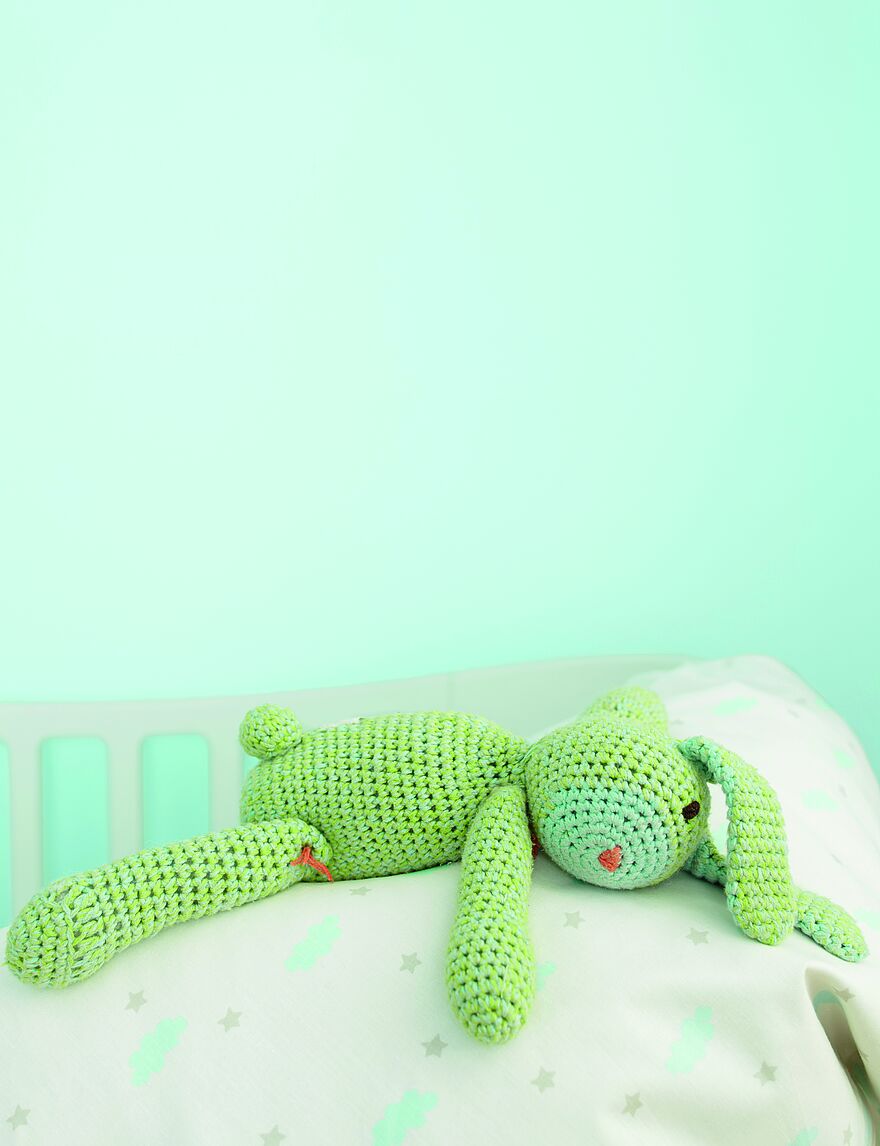 Accessoires, die die Wandfarbe aufgreifen oder farblich zu ihr passen, sorgen für Frische und Abwechslung im Babyzimmer. Der freundliche Strickhase setzt einen attraktiven Farbakzent, der dem Raum Struktur und Tiefe verleiht. Ebenso können wohl abgestimmte Accessoires ein Babyzimmer farblich auflockern. Wenn Sie beispielsweise ein Babyzimmer hauptsächlich in Blautönen einrichten, können warmtonige Accessoires wie gelbe Kissen, rote Stofftiere oder karamellfarbene Decken den Raum optisch aufwärmen und schaffen dezente Kontraste.
