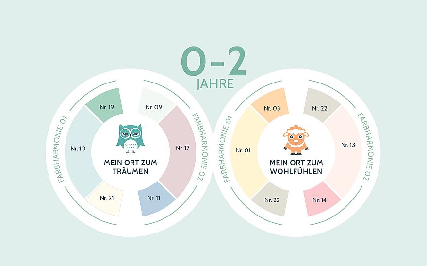 In der Altersstufe von 0 bis 2 Jahren sollte das Babyzimmer grundsätzlich ein Ort zum Träumen und Wohlfühlen sein. Wir zeigen, welche Farben sich dafür besonders eignen – und welche Farbkombinationen am besten miteinander harmonieren. Die größeren Farbsegmente eignen sich ausgesprochen gut als Grund- bzw. Flächenfarben und die flankierenden, kleineren Segmente als passende Akzenttöne. Im folgenden Abschnitt haben wir ein paar Beispiele für Sie zusammengestellt, wie die Farbharmonien im Babyzimmer eingesetzt werden können, aber auch einige Alternativen aufgeführt, die ebenfalls wunderbar zusammen passen.