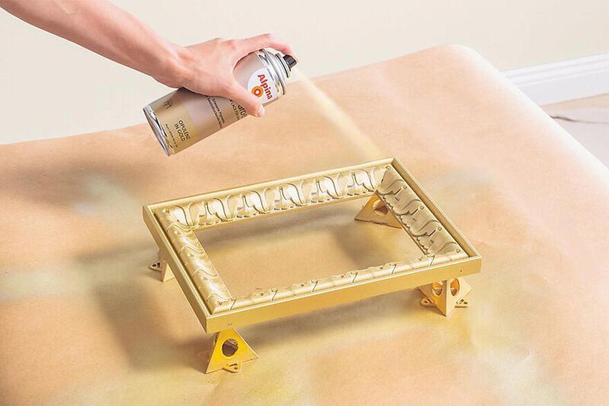 Beim Lackieren von feingliedrigen Möbeln sowie filigranen Dekorationsobjekten und Wohnaccessoires mit kleinen Flächen wie Bilderrahmen, Figuren und Tischleuchten verwenden Sie idealerweise Sprühlack. Mit diesem, z. B. aus dem Sortiment der Alpina Feine Farben Sprühlacke, gelingt Ihnen mühelos eine einheitliche Lackierungbis in den kleinsten Winkel. In unserer Schritt-für-Schritt-Lackieranleitung zeigen wir Ihnen, wie Sie einen Bilderrahmen mit Sprühlack perfekt lackieren können.