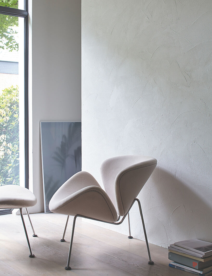 Die raue Struktur des Farbrezepte KREATIV-PUTZ passt als kontrastreiches Element hervorragend zu glatten Oberflächen und Möbelstücken mit einer betont geradlinigen, cleanen Formensprache, beispielsweise zur klassischen Moderne mit ihren sanften Grau- und Greigetönen. Ebenso ist der Effektputz der ideale Begleiter zu den Farbrezepten „einfach erholt“ und „einfach entspannt“. In Verbindung mit Farbtönen wie dem hellen Grün „Balance“, dem warmen Beige „Tea-Time“ und dem ruhigen Hellgrau „Kieselstrand“ werden die Natürlichkeit und die pure Note des Effektputzes betont.