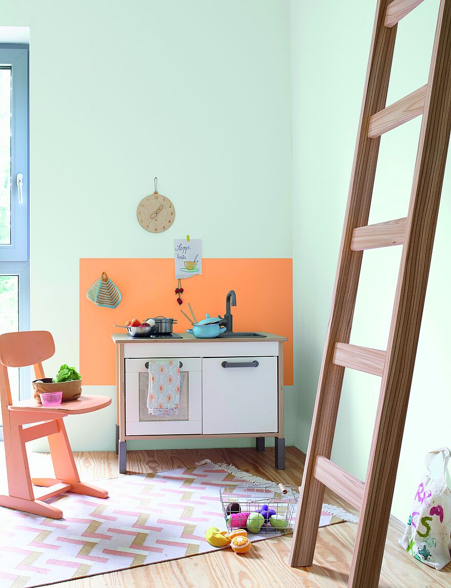 Helle Blautöne wie das Alpina Farbenfreude Fischblau schaffen Offenheit und einen Raum voller Klarheit und Leichtigkeit. Diese Wirkung wird durch ein fröhliches Orange noch einmal gesteigert. Das Alpina Farbenfreunde Fuchsorange erzeugt eine heitere Atmosphäre und sorgt als Akzentfarbe für eine glückliche, ausgelassene Stimmung im Spielzimmer.