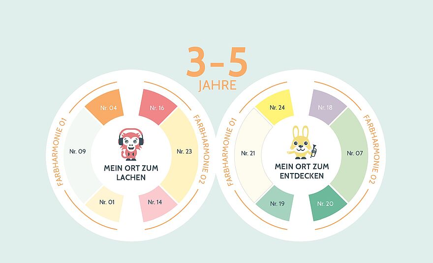 In der Altersstufe von 3 bis 5 Jahren ist das Kinderzimmer hauptsächlich ein Ort zum Lachen und Entdecken. Mit den richtigen Farben lassen sich diese beiden zentralen Bedürfnisse gezielt unterstützen. Die Alpina Farbexperten haben zwei Farbharmonien entwickelt, mit denen Sie schnell und einfach die richtigen Farben finden und gekonnt kombinieren können. Die Grafik bietet einen Überblick über die zwei zentralen Harmonieräume. Die großen Farbsegmente eignen sich als Flächenfarben, die angrenzenden kleineren Segmente als passende Akzentfarben. Je nach Raumaufteilung, Zimmereinrichtung und persönlichen Vorlieben lassen sich die kleiner dargestellten Akzentfarben auch als Flächenfarben einsetzen. Als Grundrezept für die Raumgestaltung gilt dabei generell: zwei Drittel des Raumes sollten in beruhigenden Tönen und ein Drittel in anregenden Tönen gestrichen werden.