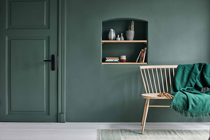 Grün als Wandfarbe strahlt Ruhe und Geborgenheit aus, kann aber gleichzeitig Kreativität und Tatendrang anregen. Dadurch schafft es eine ausgeglichene Atmosphäre sowohl in Arbeits- als auch Wohnbereichen.