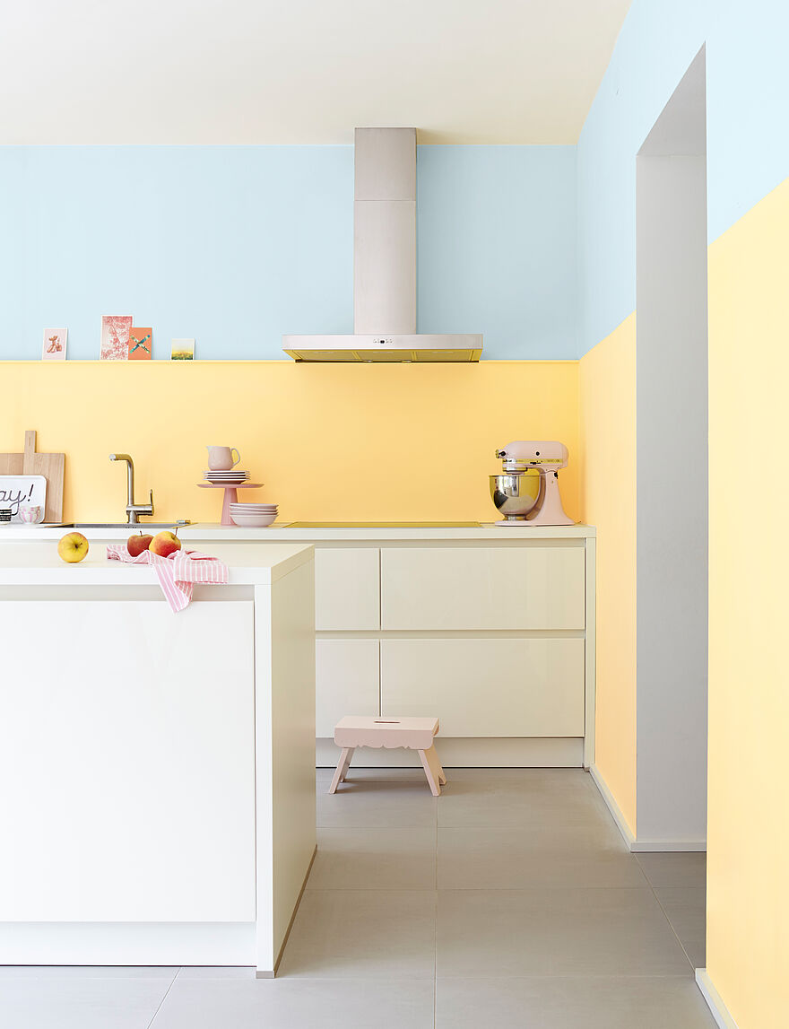 In Kombination mit Grün oder Blau entsteht bei der Raumgestaltung eine natürliche, aufmunternde Atmosphäre. Je nach Gelbton passen unterschiedliche Grüntöne von hellem Pastellgrün über Maigrün bis zu Schilf und Oliv. Das Zusammenspiel mit Petrol sorgt für eine junge und peppige Stimmung. Sonnige Gelbtöne wie z. B. die Nuancen „Sommerzeit“ oder „Sonnenstrahl“ der Alpina Farbrezepte in Kombination mit Blau, so z. B. in der Küche, sorgen ebenfalls für einen peppigen Raumcharakter.