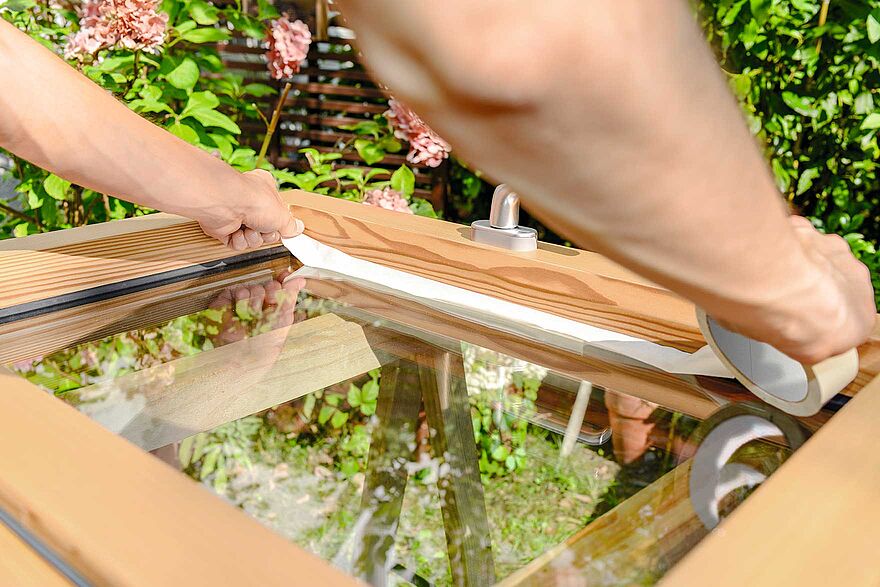 Um die Fensterscheibe zu schützen, kleben sie das an den Rahmen angrenzende Glas sorgfältig mit Klebeband ab. Zusätzlich können Sie mit etwas Folie oder einem Malervlies ihren Arbeitsbereich vor Farb- und Lasurspritzern schützen.