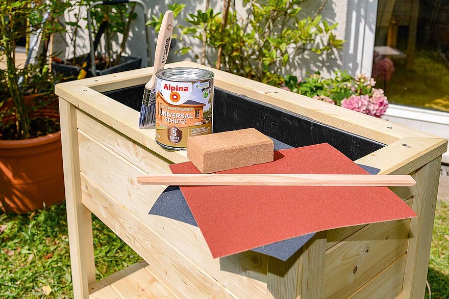 Für die Lasur des Holzbeets haben wir die Alpina Universal-Schutz Holz-Lasur für außen genutzt. Neben der farblosen Lasur gibt es auch Holzschutzlasuren in verschiedenen Farbtönen, die Sie ganz nach Ihrem Geschmack auswählen können. Bei schwer mit dem Pinsel erreichbaren und kleinteiligen Holzobjekten bietet sich das Lasieren mit dem Alpina Spray-Schutz an.