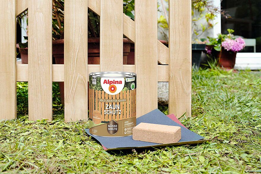 Kommen rohe, unbehandelte Nadelhölzer beim Zaunbau zum Einsatz, sollten diese vor dem ersten Anstrich mit dem Alpina Holzschutz-Grund behandelt werden. Dieser beugt Bläuepilzen vor, imprägniert tiefenwirksam und schützt das Holz langanhaltend von Innen.