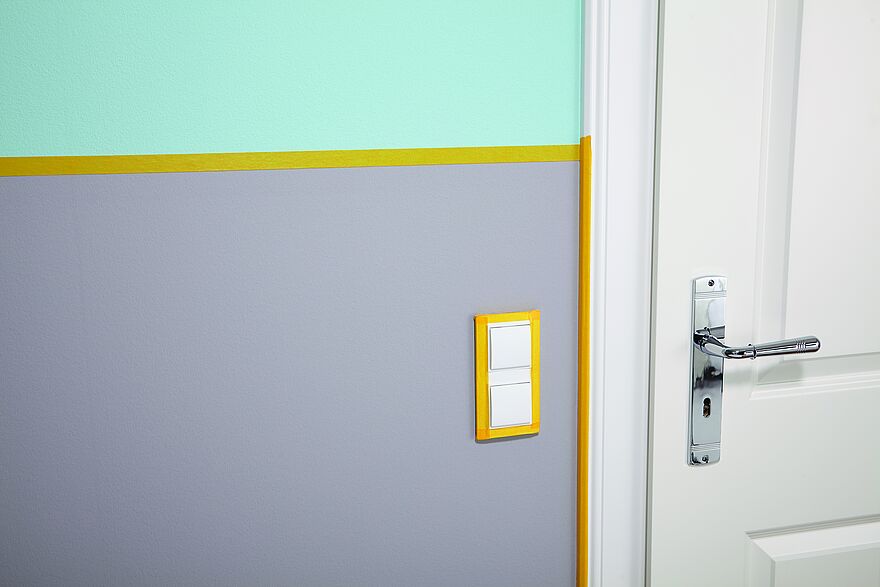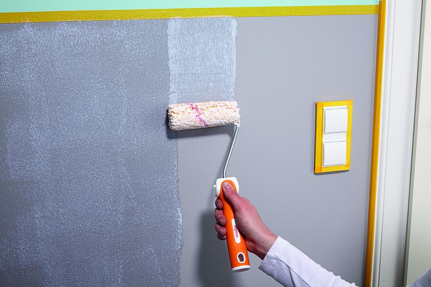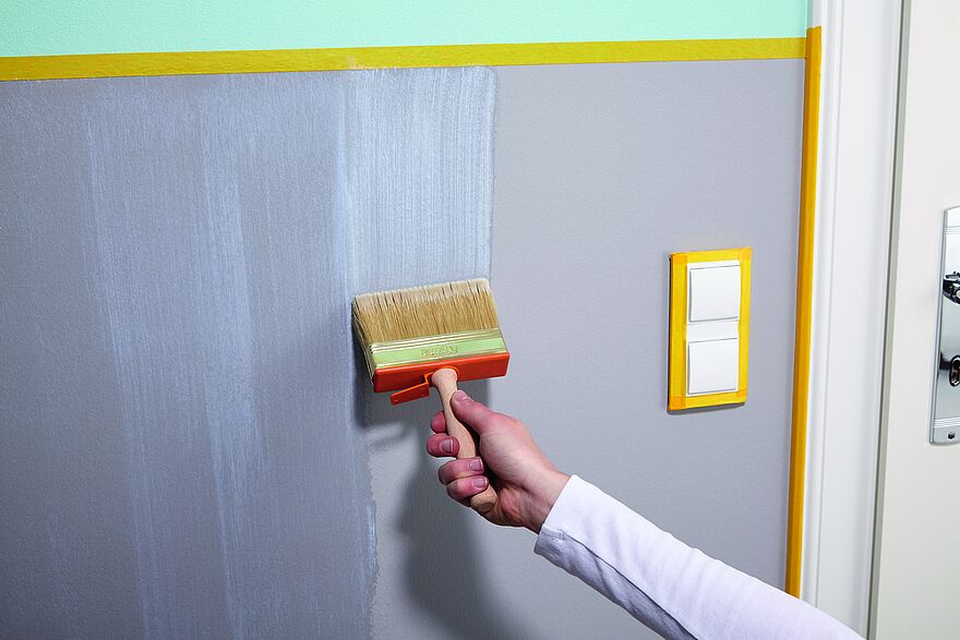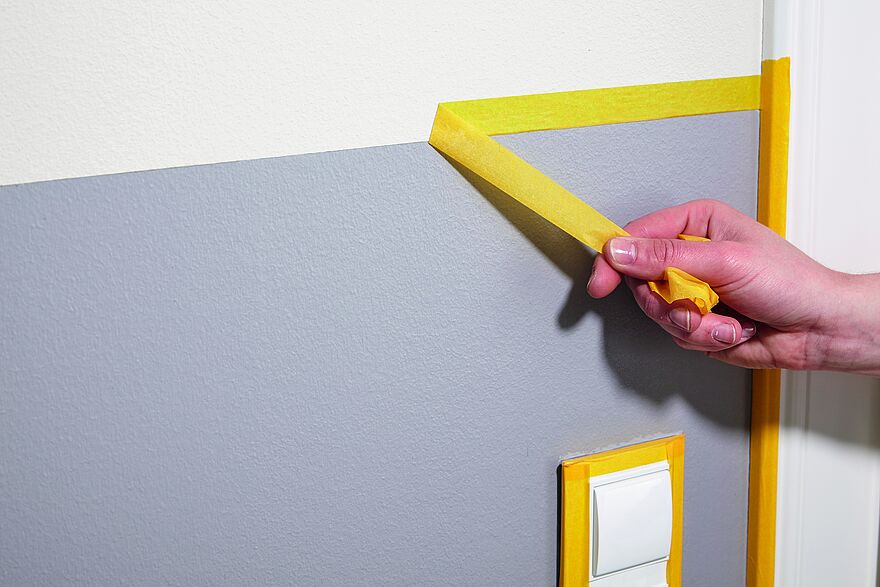 Kleben Sie zu schützende Bereiche, wie Lichtschalter oder Türrahmen, mit Malerband ab. Auch abgetrennte Bereiche, etwa ein Sockel oder eine halbhoch gestrichene Wand, werden mit einem Streifen Malerband abgeklebt.