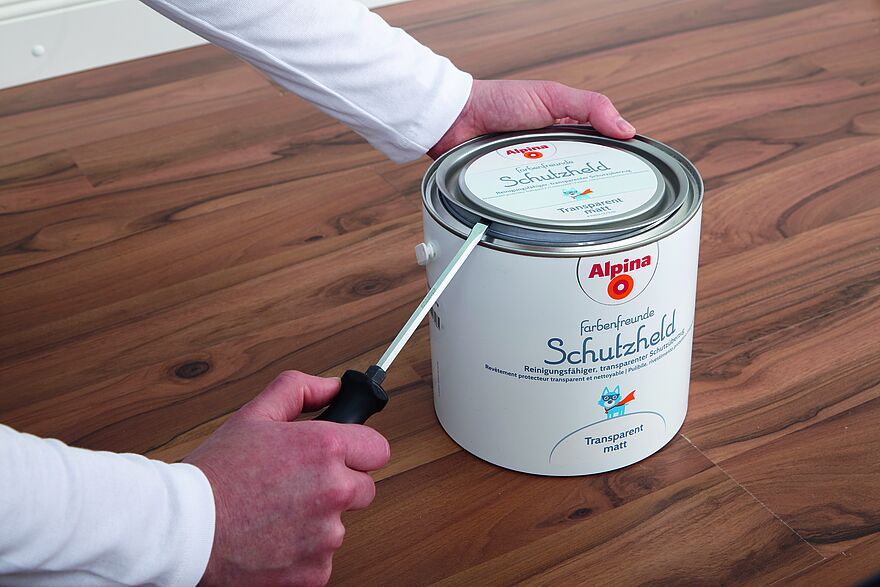 Den Deckel der Farbdose vorsichtig mit einem Schraubendreher ringsherum anheben und den Deckel abnehmen.
