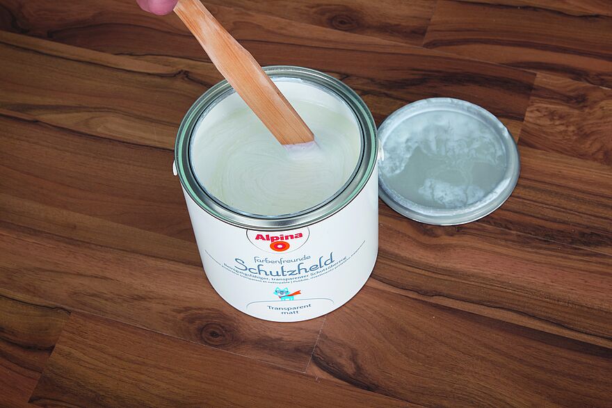 Vor der Anwendung wird die Schutzfarbe mit einem Rührholz (aus dem Baumarkt) gut aufgerührt.