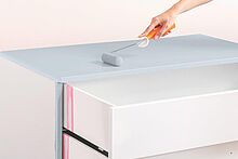 Schleifen Sie die Lackoberfläche nach einer Trocknungsphase von 12 Stunden leicht mit einer feinen – 180er bis 240er – Körnung an und reinigen Sie die Fläche mit einem Staubtuch.