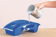 Bei der Verwendung von Lackrollern füllen Sie den Lack vorher in eine Lackwanne um. So lässt sich die Rolle gleichmäßig eintauchen und überschüssiger Lack einfach abstreifen.