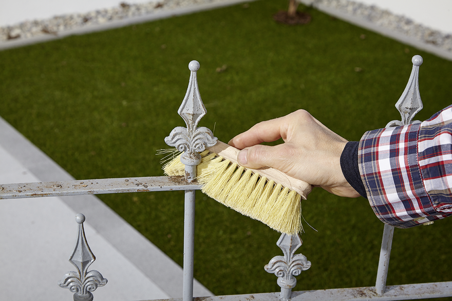 Damit der Lack später gut haftet, fegen Sie den Zaun gründlich mit einem Handfeger ab, um ihn vom Schleifstaub zu befreien.