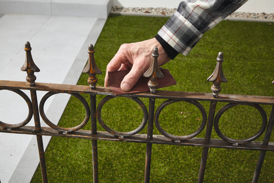 Neue Eisenzäune haben eine sehr glatte Oberfläche, auf der Lack nur schwer haften kann. Außerdem rosten unbehandelte Zaun-Elemente schnell an – eine Behandlung mit Metallschutz ist daher unumgänglich. Schleifen Sie den Zaun dafür vor dem Lackieren an – so rauen Sie seine Oberfläche auf und der Lack kann sich besser verankern.
