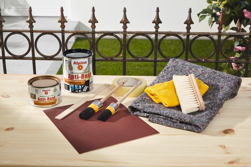 Beim Lackieren des Zauns kommt es auch auf das richtige Werkzeug an: Bei den Alpina Anti-Rost Metallschutz-Lacken handelt es sich um Kunstharzlacke, daher eignen sich Pinsel aus Naturborsten, denn diese sorgen für die optimale Verarbeitung und den optimalen Verlauf. Mit einem Pinsel können Sie direkt aus der Lackdose arbeiten. Greifen Sie bei größeren Flächen besser zu Lackrollern mit diesen können Sie schnell und einfach lackieren und sie sorgen für eine einheitliche und feine Oberfläche. Bei größeren Werkzeugen wie z. B. einem solchen Lackroller sollten Sie den Metallschutz-Lack vorher in eine Lackwanne umfüllen.