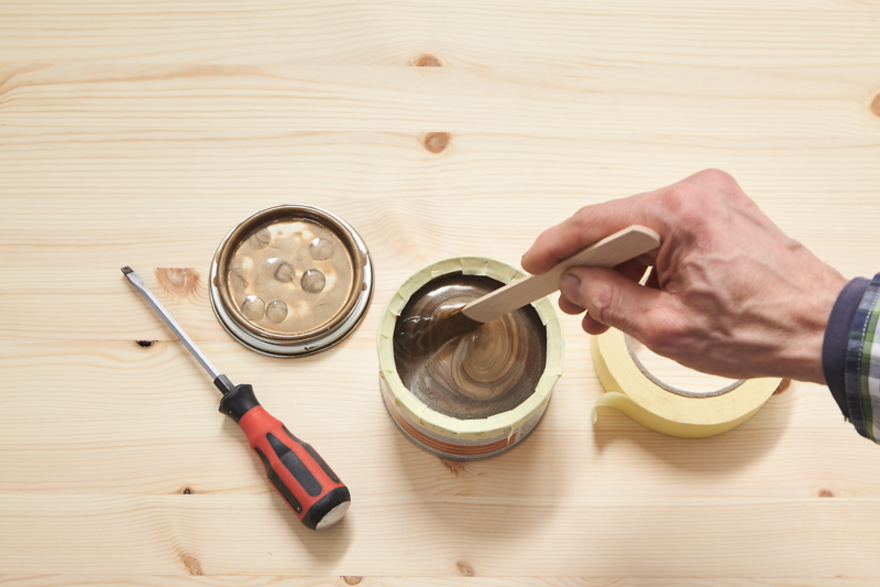 Öffnen Sie die Lackdose vorsichtig mit einem Schraubenzieher. Das geht am besten, wenn Sie Stück für Stück den Deckel rund herum anheben. Wird er nur an einer Stelle kräftig angehoben, kann er sich verbiegen und schließt später nicht mehr vollständig.