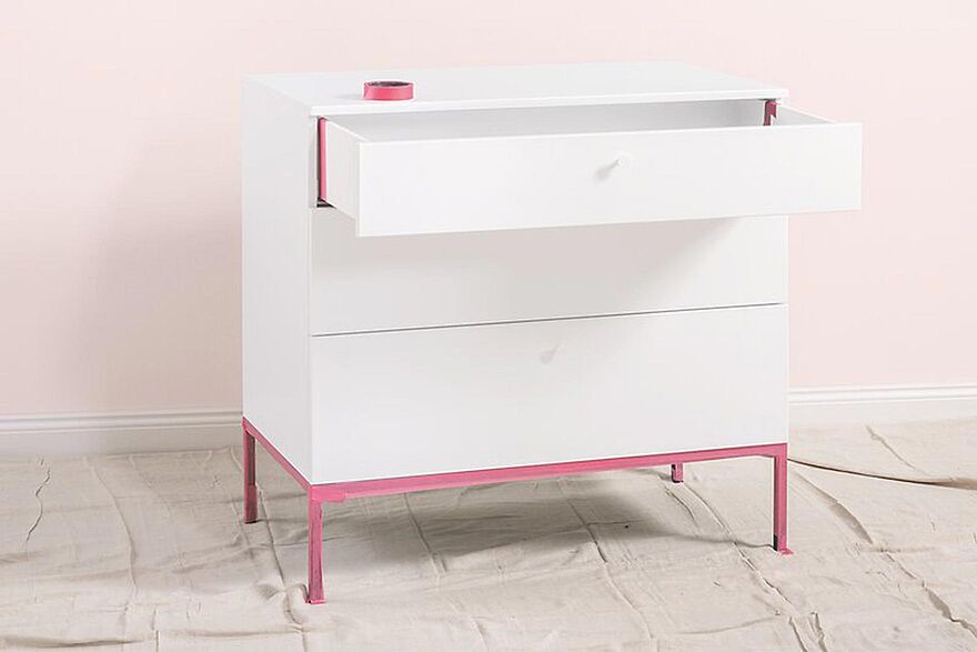 Platzieren Sie den zu lackierenden Gegenstand – hier erklärt anhand des Beispiels einer Kommode – auf einem geeigneten Untergrund, z. B. auf Blöcken und decken Sie die Umgebung mit Malervlies oder Malerfolie ab, um sie vor Lackspritzern zu schützen. So vermeiden Sie Reinigungsaufwand im Nachhinein. Schrauben Sie Scharniere etc. ab oder kleben Sie nicht zu lackierende Stellen, wie Möbelfüße, sorgfältig mit Klebeband ab.