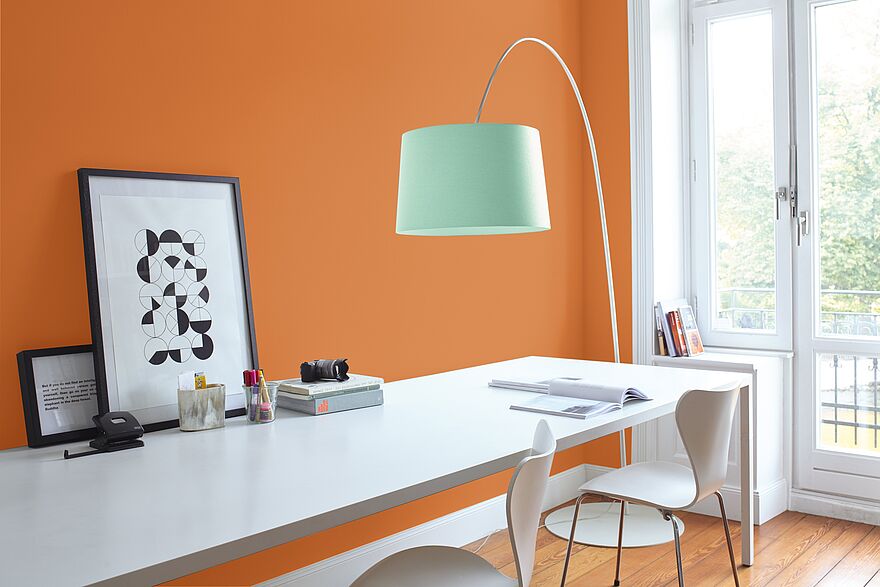 Kräftiges Orange wie „Happy Weekend“ der Alpina Farbrezepte Kollektion oder die Nuance No. 43 der Alpina Feine Farben Kollektion, BAUKUNST DER SONNE, fördert nachweislich die Kreativität, was es zu einer ungewöhnlichen, aber sehr anregenden Farbe fürs Arbeitszimmer macht. Akzente im Komplementärkontrast von hellem Blau bis Aqua bringen die Wand in Orange richtig zum Leuchten.