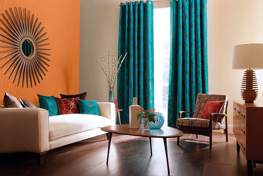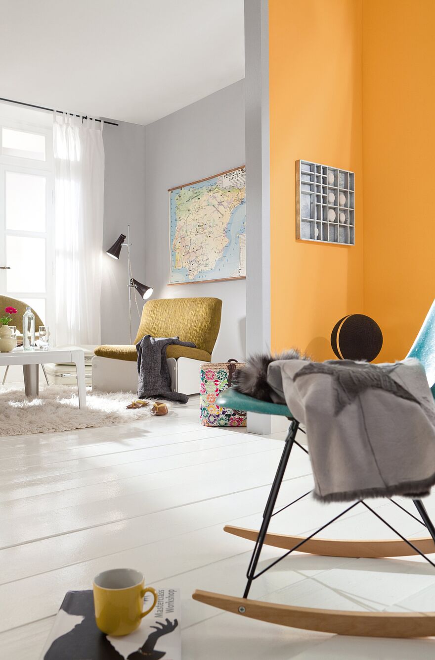 Die Dynamik der Wandfarbe Orange kann durch die kombinierte Verwendung der Farbe Grau etwas zurückgenommen werden, um eine ausgeglichene, stimmige Wohnatmosphäre zu schaffen. Komplementäre Farben wie Blau oder Türkis hingegen wirken in Kombination mit Orange belebend.