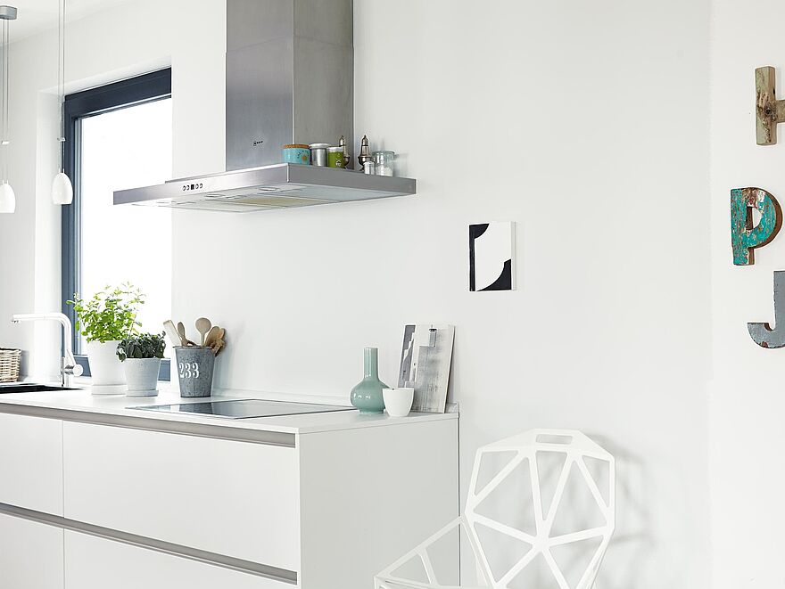Weiße Wände können in der Küche schnell in Mitleidenschaft gezogen werden, aber mit abwaschbarer Wandfarbe in Weiß wie der Wisch & Weg Wandfarbe von Alpina können kleine und auch größere Missgeschicke ganz einfach von der Wand gewischt werden. Auch auf Latexfarbe, wie z. B. Seidenlatex Innenfarbe, kann man in Küchen zurückgreifen, um ein langanhaltend strahlendes Weiß zu garantieren.