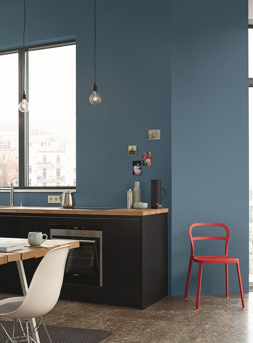 Klare Linien, Funktionalität und viel Chrom prägen das kantige, unkonventionelle Flair des Industrie-Chics. Bei der Wandfarbe der Küche passen hierzu kühle, betont architektonische Farbnuancen wie Grautöne mit blauem Unterton, Stahlblau oder Schiefer – alles für einen minimalistischen, klaren Look. Die kraftvolle, energische Formensprache dieses Stils hält aber auch kräftigen Farben stand, wissen die Farbexperten von Alpina. Moderne Küchen können auch in Bauhausorange, Chilirot oder extravagantem Smaragdgrün fantastisch aussehen.