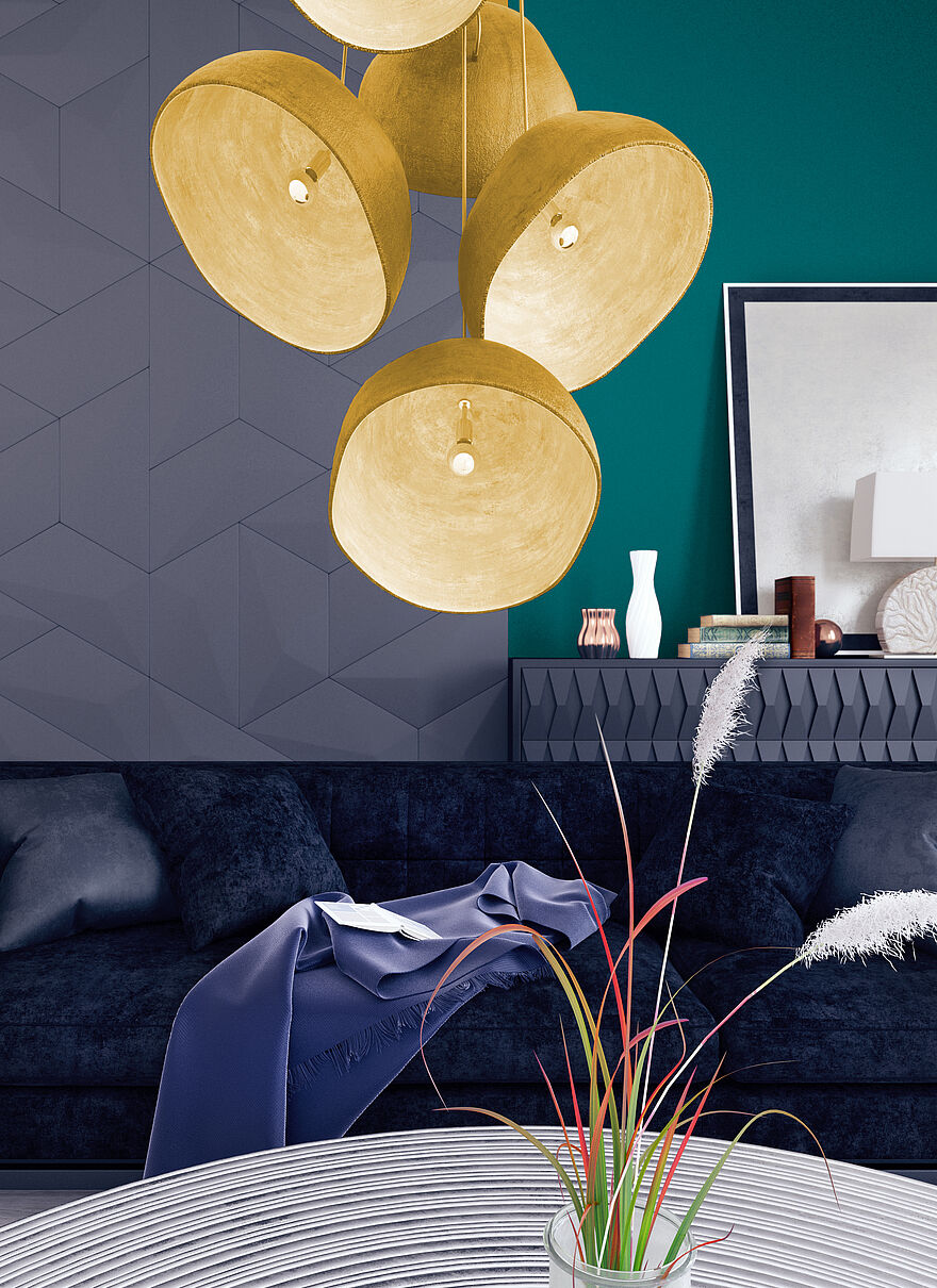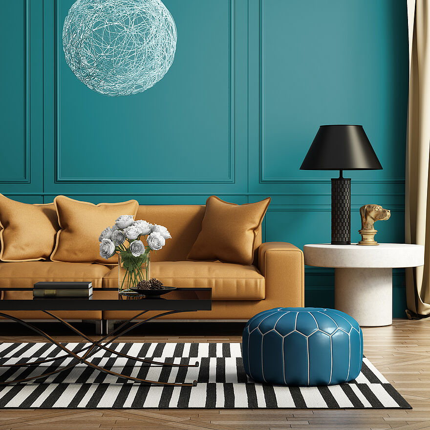 Wer es glamourös liebt, kombiniert Wandfarbe in Petrol, wie die Nuance „Petrol de Luxe“ der Alpina Farbrezepte, mit einem satten Goldgelb und goldenen Accessoires, die im Kontrast zu Petrol noch stärker leuchten. Den stilvollen Look unterstreichen edle Materialien wie Seide, Samt und klassische Möbel. Ein starker Schwarz-Weiß-Kontrast gibt dem Stil einen modernen Twist.