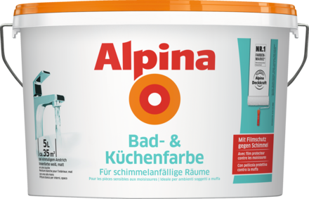 Für eine dauerhafte Renovierung schimmelbefallener Flächen kann Wandfarbe gegen Schimmel wie die Alpina Bad- und Küchenfarbe eingesetzt werden. Nach der Entfernung des Schimmels und der kompletten Durchtrocknung der Wände wird die Spezialfarbe mit 10 % Wasser verdünnt und gleichmäßig satt aufgetragen.