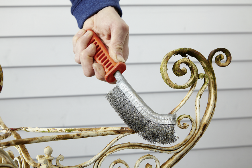 Grobe Roststellen bürsten Sie mit einer Drahtbürste ab. Der Alpina Anti-Rost Metallschutz-Lack hält zwar auf Rost, jedoch muss der Untergrund tragfähig sein.