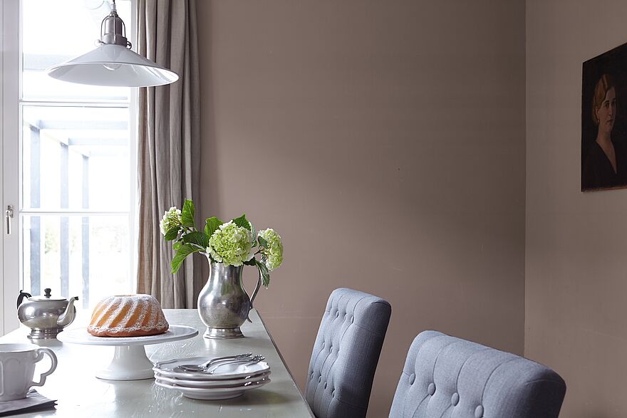 Der gedeckte Taupe-Ton der Alpina Feine Farben Nuance No. 05, „Dichter der Erde“, wirkt hingegen erdig, unprätentiös und verbreitet eine warme Ruhe. Er ist kräftig, ohne laut zu wirken und markant, ohne dominant zu sein. Die Farbe ist tief, warm, elegant und hat einen luxuriösen Touch, tritt dabei aber immer mit Understatement auf und ist ein ausgesprochen angenehmer Wohnpartner. In Kombination mit Weiß und Creme wirkt er harmonisch und besonders einladend.