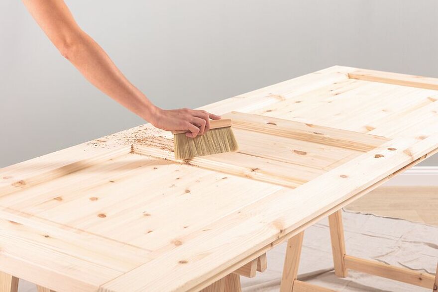 Beim Anschleifen des Türrahmens entsteht eine Menge Staub, der vor dem Lackieren wieder vollständig entfernt werden muss. Dafür nutzen Sie ein fusselfreies Tuch oder saugen die Staubpartikel mit dem Staubsauger und einem weichen Bürstenvorsatz ab.