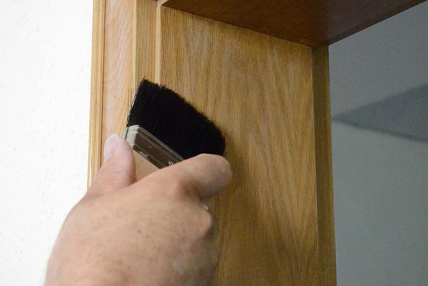 Lack gut aufrühren und mit einem Flachpinsel wieder zuerst die Füllungsprofile und den Falz ausstreichen.