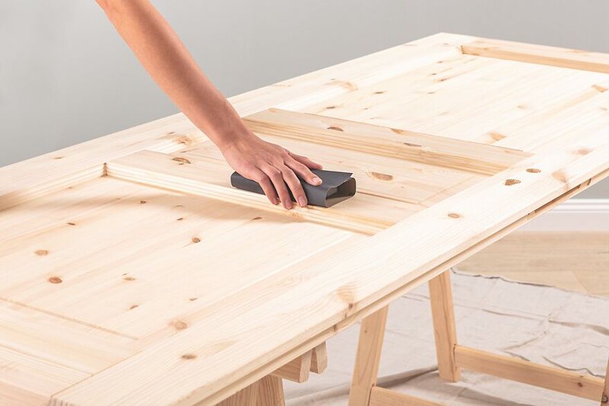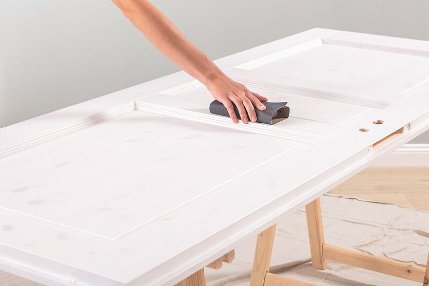 Die grundierte Tür noch einmal mit einer. 120er Körnung anrauen. So kann der Lack optimal auf dem Untergrund haften. Nach jedem Anschleifen die Oberfläche gründlich abstauben.