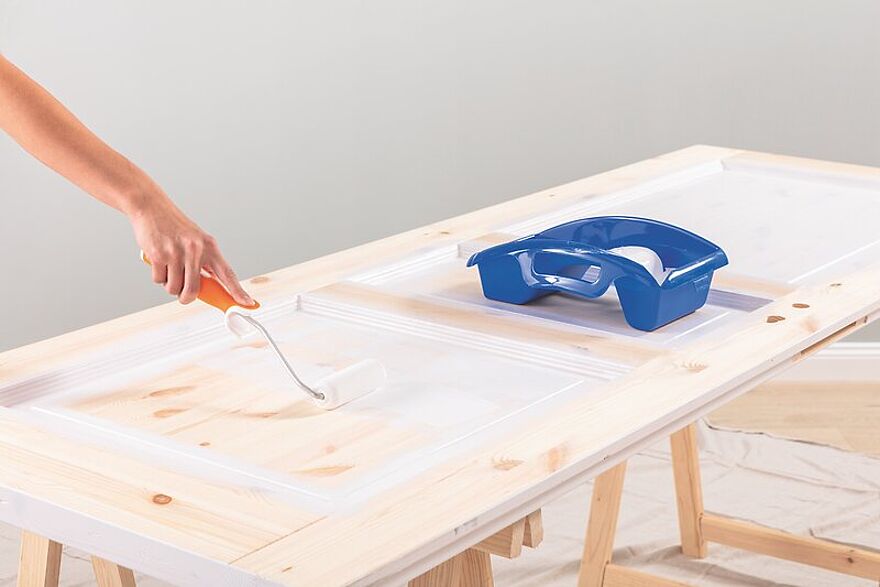 Es folgen die Füllungsflächen: Mit einer Lackrolle den Lack großflächig in einer Richtung von einer Seite zur nächsten auftragen und bis in die Ecken verteilen. Dadurch streichen Sie „nass in nass“ und der Lack kann gleichmäßig trocknen.