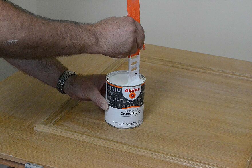 Grundierung gut aufrühren und auftragen. Zuerst mit einem Pinsel die Füllungsprofile und den Falz rundum streichen. dann mit einer Lackrolle die Flächen grundieren und 6-8 Stunden trocknen lassen.