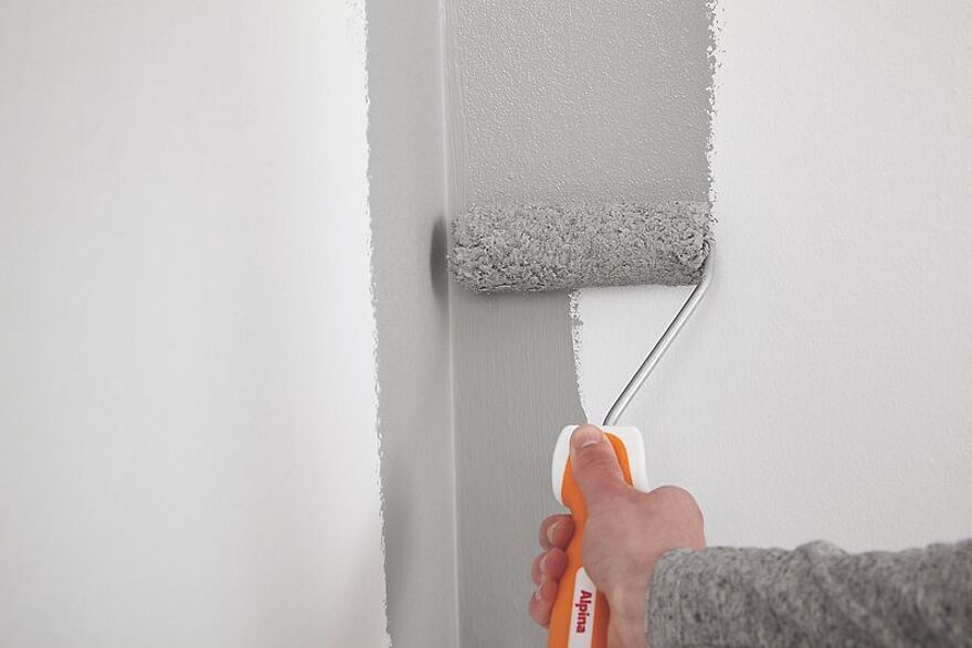Noch im nassen Zustand wird die Wandfarbe in der Wandecke mit dem großen Farbroller überarbeitet. Auf diese Weise – „nass in nass“ – können Sie verhindern, dass unschöne Farbränder entstehen.