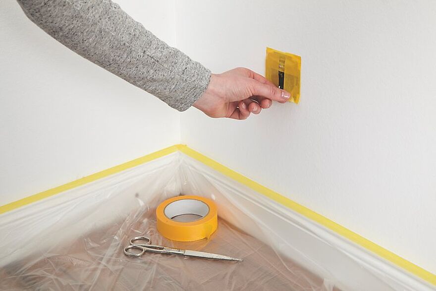 Montieren Sie die Steckdosen und Lichtschalter ab und/oder kleben Sie diese sorgfältig mit Malerband ab. Achtung, den Strom unbedingt abschalten! Kleben Sie Türzargen und die Kanten von Fensterrahmen ebenfalls mit Malerband ab. Bedecken Sie danach noch die Türflächen mit Folie oder Malervlies.
