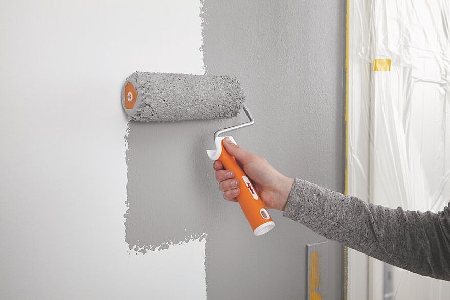 Setzen Sie den Farbroller auf Schulterhöhe an die Wand und verteilen Sie die Wandfarbe durch Abrollen zuerst nach oben und dann nach unten.