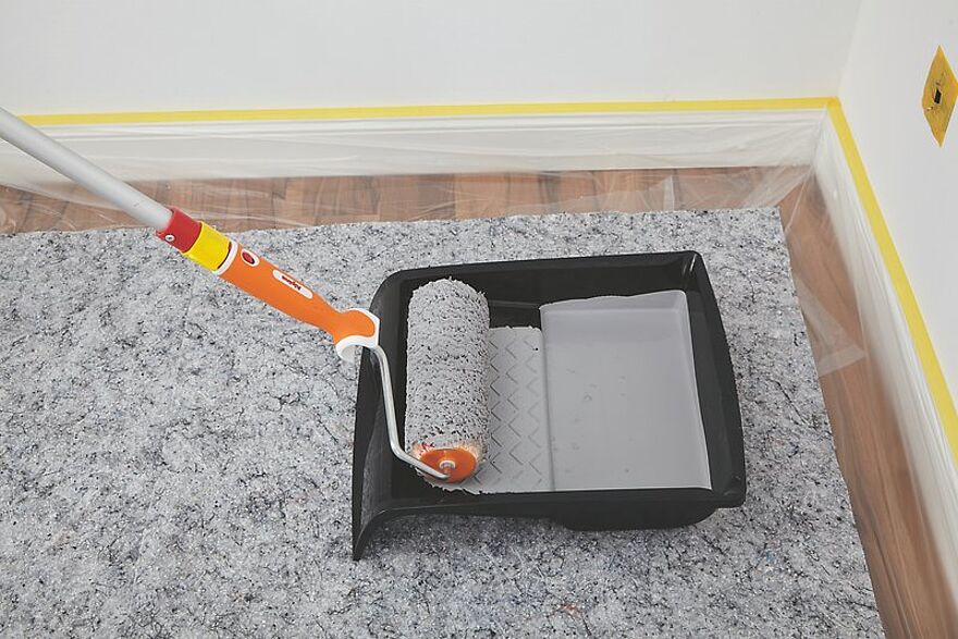 Die Fußleisten vor dem Streichen mit Malerband abkleben und den Fußboden mit Malerfolie auslegen. Spezielle Malerfolien mit Klebestreifen sparen einen Arbeitsschritt. Alternativ können Sie den Boden mit Malervlies bedecken.