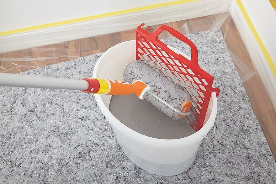 Wer zu billigen Malerrollen greift, spart an der falschen Stelle. Rollen aus Plüsch oder Vestan hinterlassen Fussel und Fasern an der Wand. Daher ist es wichtig, sich geeignete Utensilien bereitzulegen: Passt die Malerrolle in den Farbeimer? Falls nicht, brauchen Sie eine Farbwanne, um richtig abrollen zu können. Bei größeren Farbeimern reicht meist auch ein Abstreifgitter.