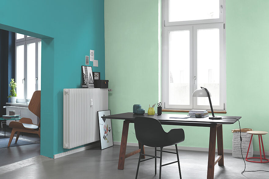 Kreative schicken ihren Geist auf Reisen, indem sie im Arbeitszimmer Aqua- und Türkistöne als Wandfarbe wählen. Ein kühler Türkiston gibt Räumen Weite und lässt die Gedanken auf Reisen gehen. Zarte Blau- und Türkistöne eignen sich besonders gut für kleine Arbeitsräume, da die Wände optisch vom Betrachter zurückweichen. So erreichen Sie im Homeoffice Weitblick, schaffen neue Blickwinkel und ruhige Gelassenheit. Um die Kälte des Farbtons auszubalancieren, setzen Sie als Gegenpole warme Wandfarben und verspielte Details ein.