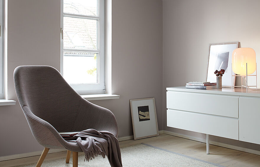 Die Ton-in-Ton-Kombination mit Violett wirkt nicht nur besonders harmonisch, sondern verleiht Ihrem Zuhause zudem eine intensive Farbigkeit. Das Zusammenspiel mit der Alpina Farbrezepte Nuance „Muschelweiß“ erzeugt hingegen eine ruhige und sanfte Raumwirkung.