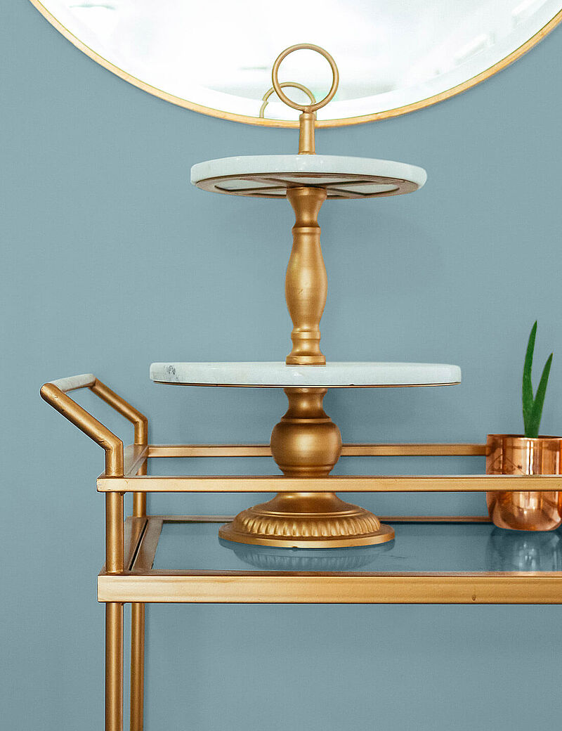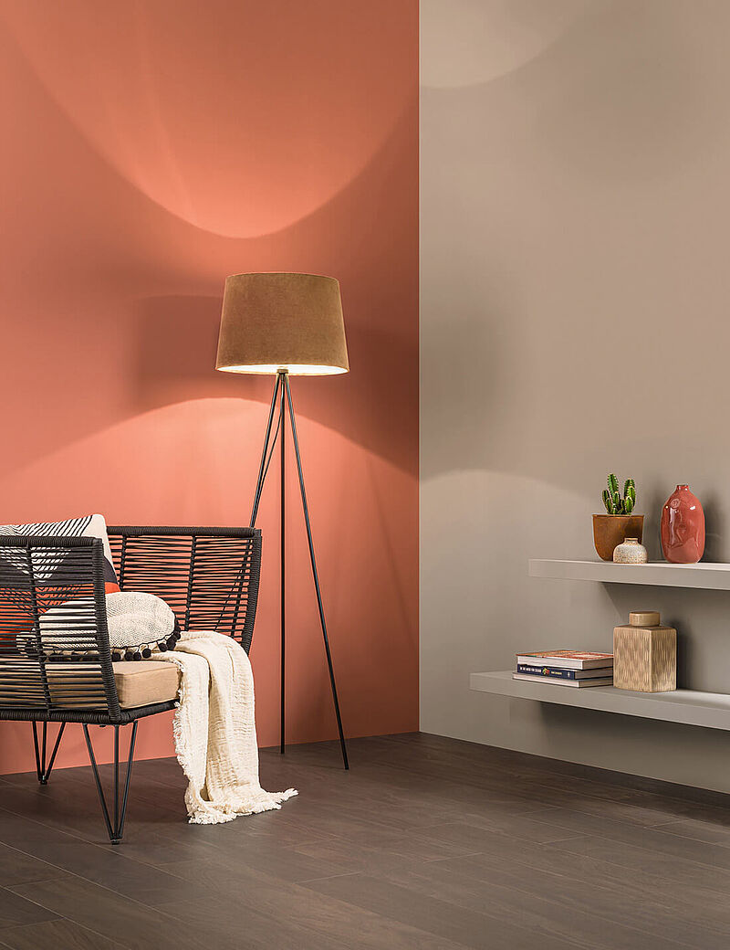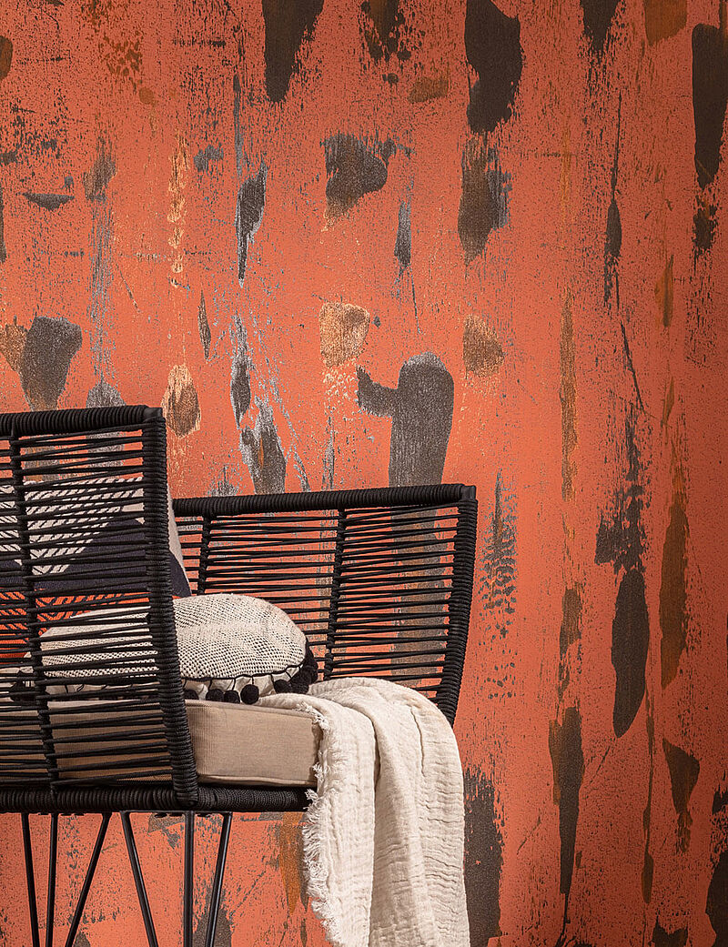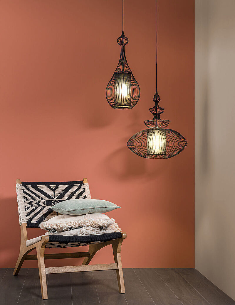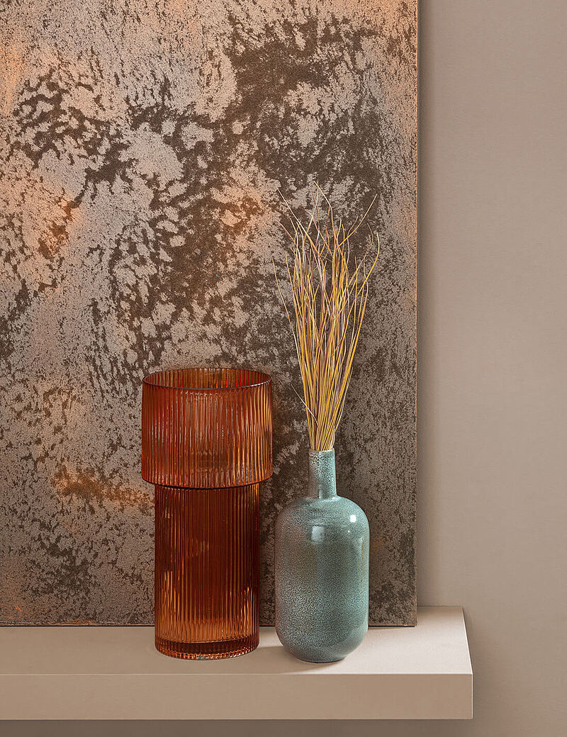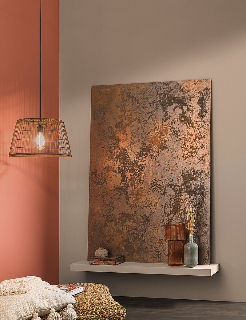 Alle Farben des Orients, und vor allem die erfrischenden Wassernuancen, lieben Gold und Kupfer, denn die warmglänzenden, edlen Metalle bringen die elegante Seite der Naturtöne zum Strahlen. Fokuswände oder -säulen mit Kreativ-Effekt in Rost- oder Metallic-Farben machen diesen Eindruck perfekt, ebenso feine Samt-Accessoires, während raue, natürliche Materialien, Flechtwerk, Webstrukturen und feine, dunkle Hölzer die Farbwelt zum lebensfrohen Boho-Style ergänzen.
