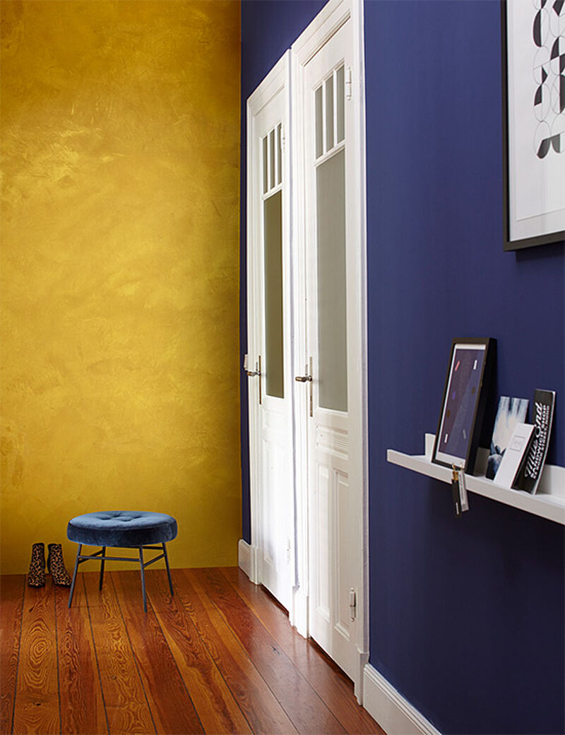 An kostbaren Lapislazuli erinnert das extravagante Zusammenspiel mit luxuriösen Goldeffekten und die Verbindung mit Schwarz verleiht dem Raum Dramatik, Charakter und Tiefe.