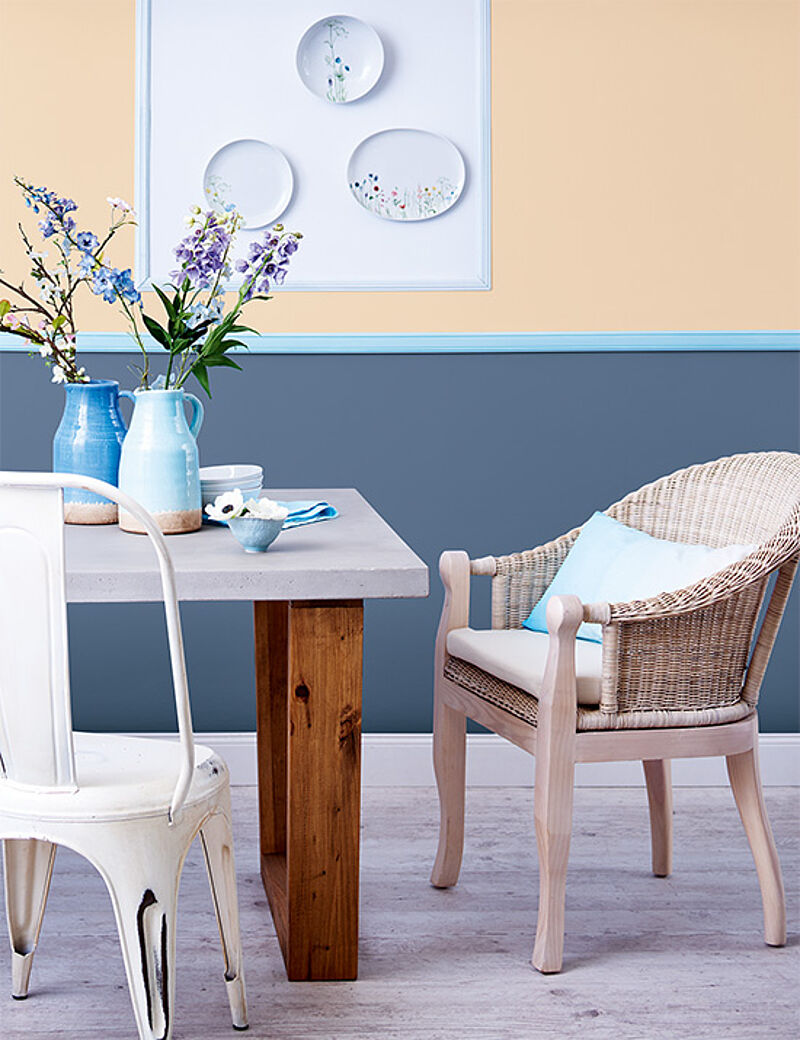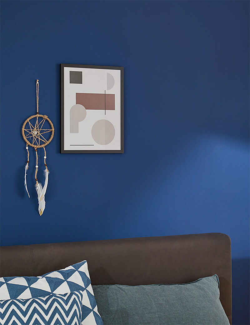 Blaue Stunde kann mühelos für sich alleinstehen, bringt in der Kombination aber auch alle anderen Farben zum Strahlen: Sanfte Beigetöne lässt dieser tiefe, matte Blauton noch gemütlicher und einladender erscheinen und der Kontrast mit Weiß wirkt maritim und frisch wie eine Meeresbrise.