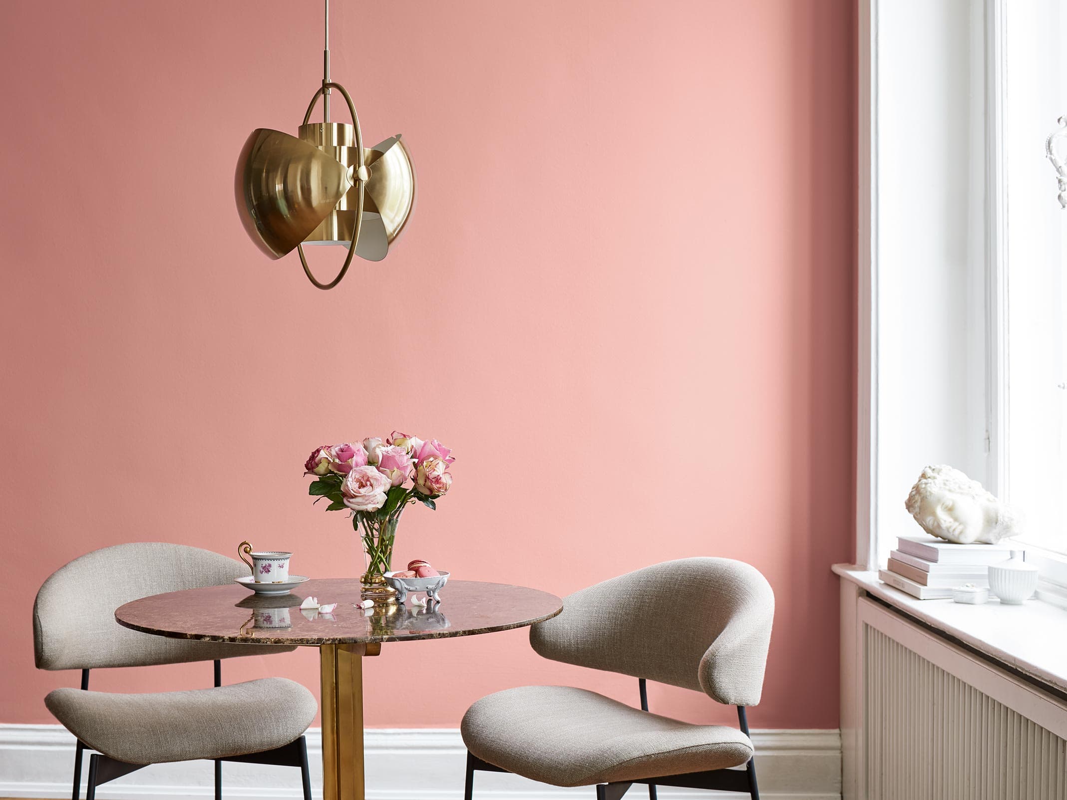 Wenn schon, denn schon: Dieses selbstbewusste Puderrosa verträgt sich gut mit extravaganten, grazilen Möbelstücken. Seine zarte Opulenz wird durch goldene Metallic-Akzente sowie feinstes Porzellan, Antiquitäten und romantische Blumensträuße zusätzlich betont.