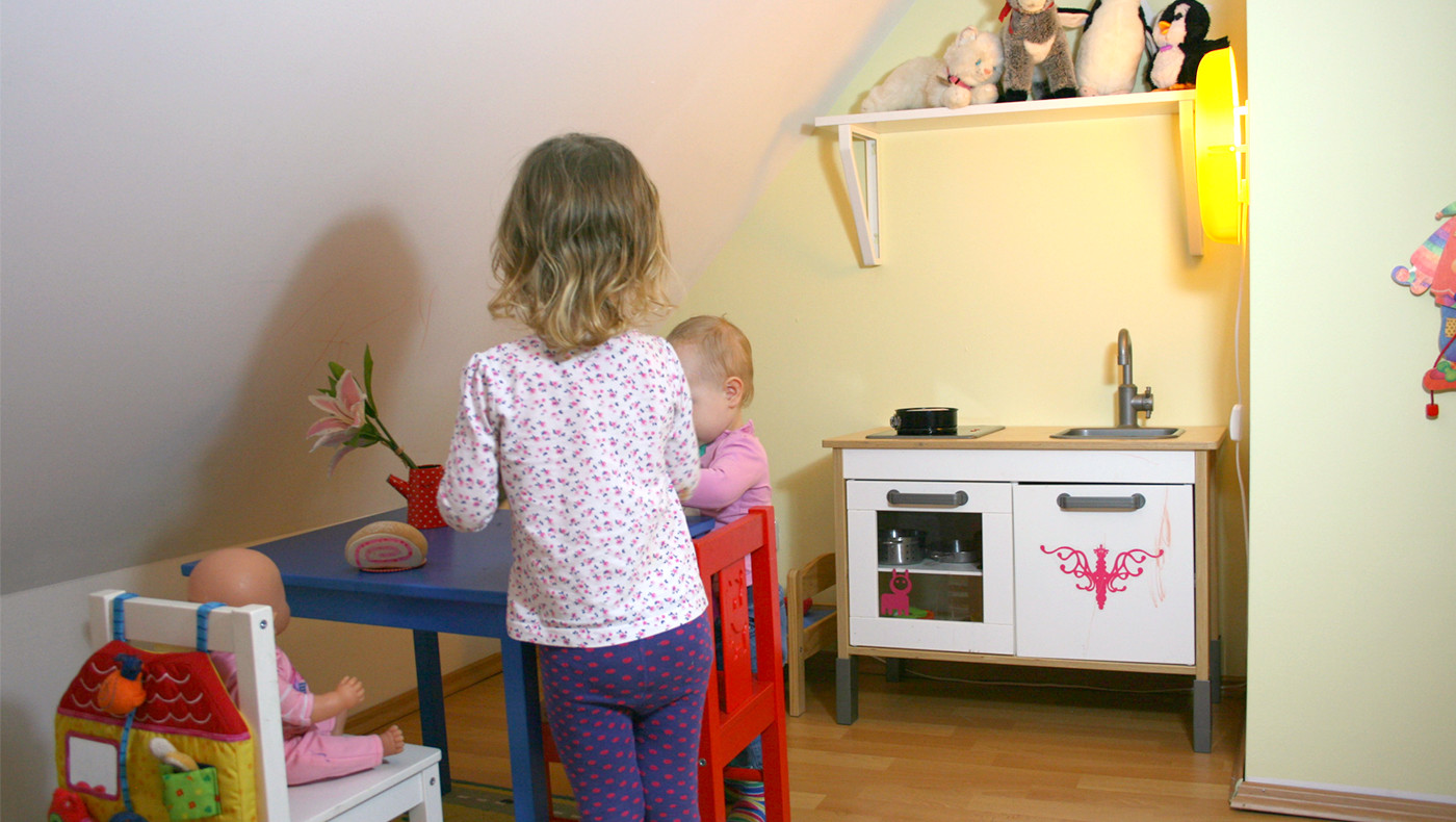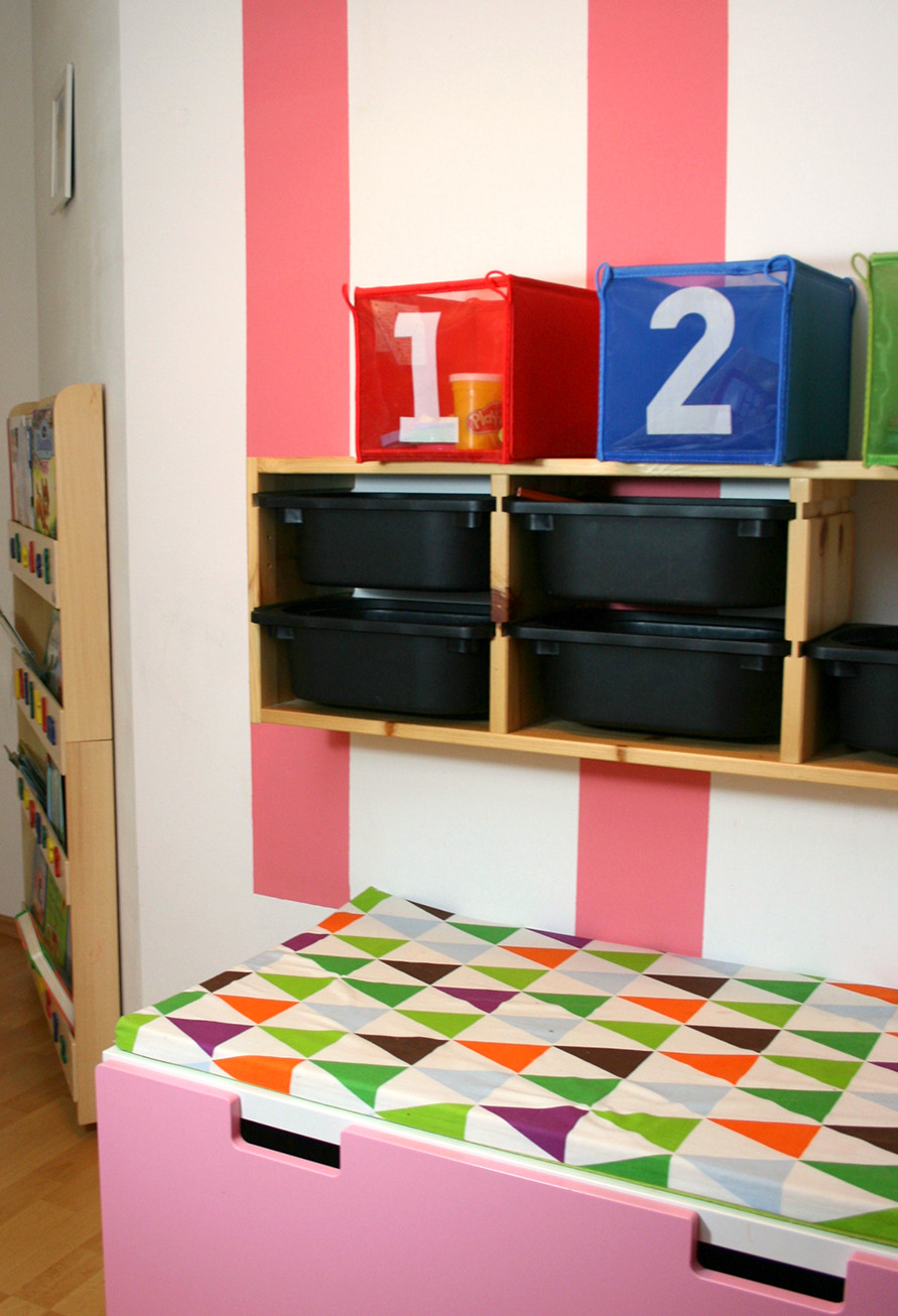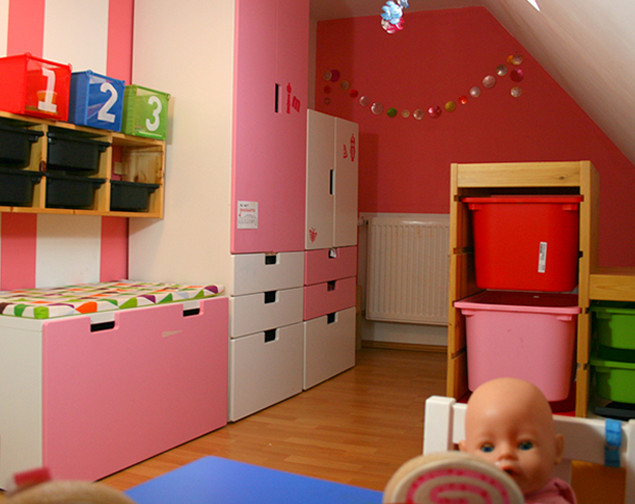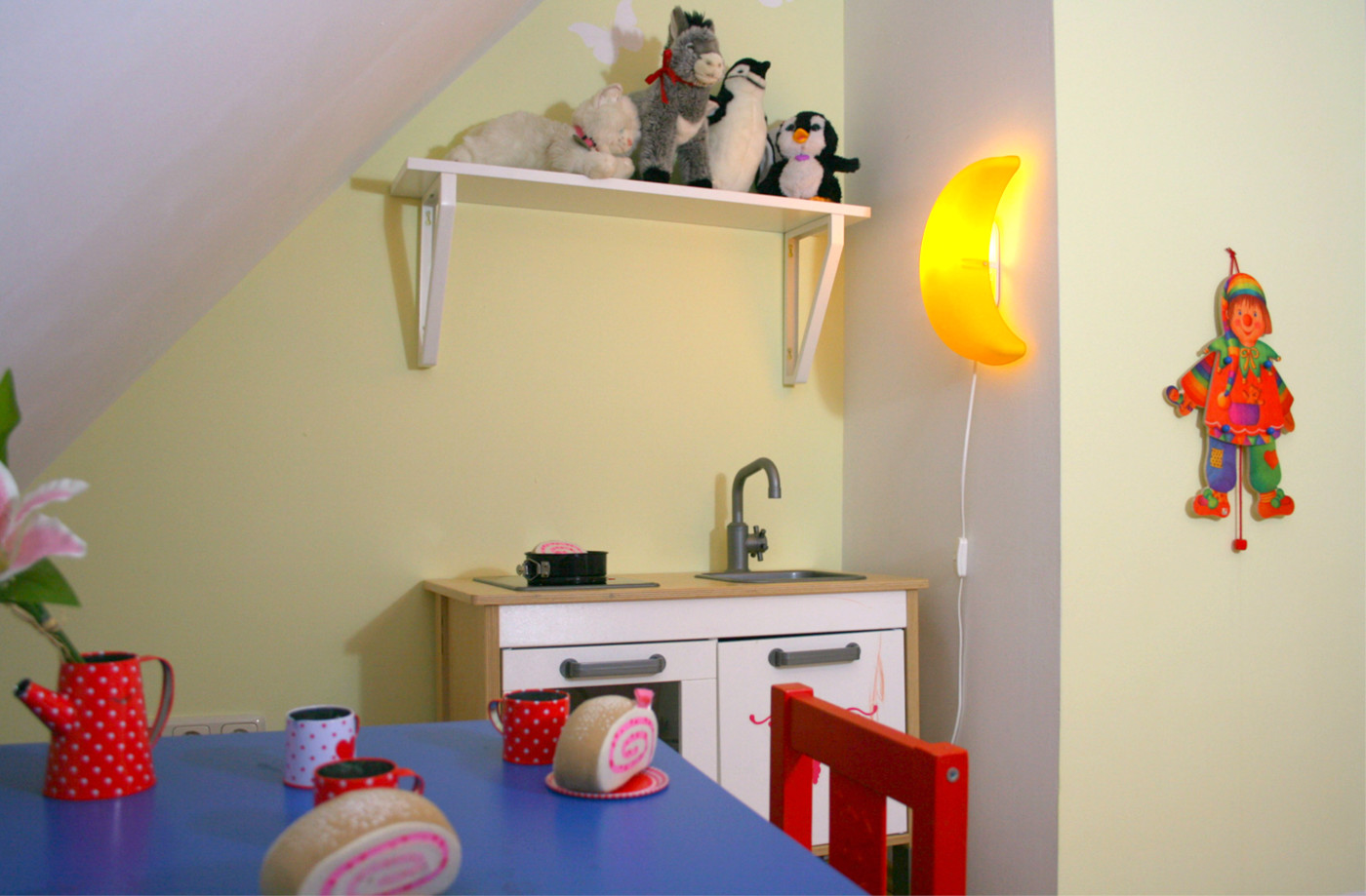 Das Zimmer ist ein Spielzimmer für zwei kleine Mädchen – 4 und 1,5 Jahre sind sie alt und mit diesen Farben werden sie noch eine lange Zeit glücklich sein. In der Küchenecke wird gebacken, gemalt und gebastelt. In der Kuschelecke ist Platz zum Lesen und Träumen.