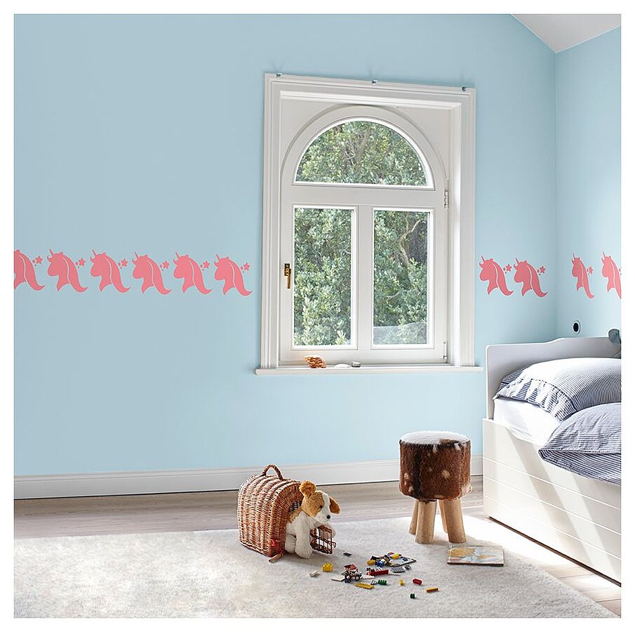 Für eine Einhorn-Wandbordüre zeichnen Sie einfach mit Hilfe einer Wasserwaage und eines Bleistifts eine dünne Linie auf die Wand. An ihr können Sie alle Einhörner ausrichten.