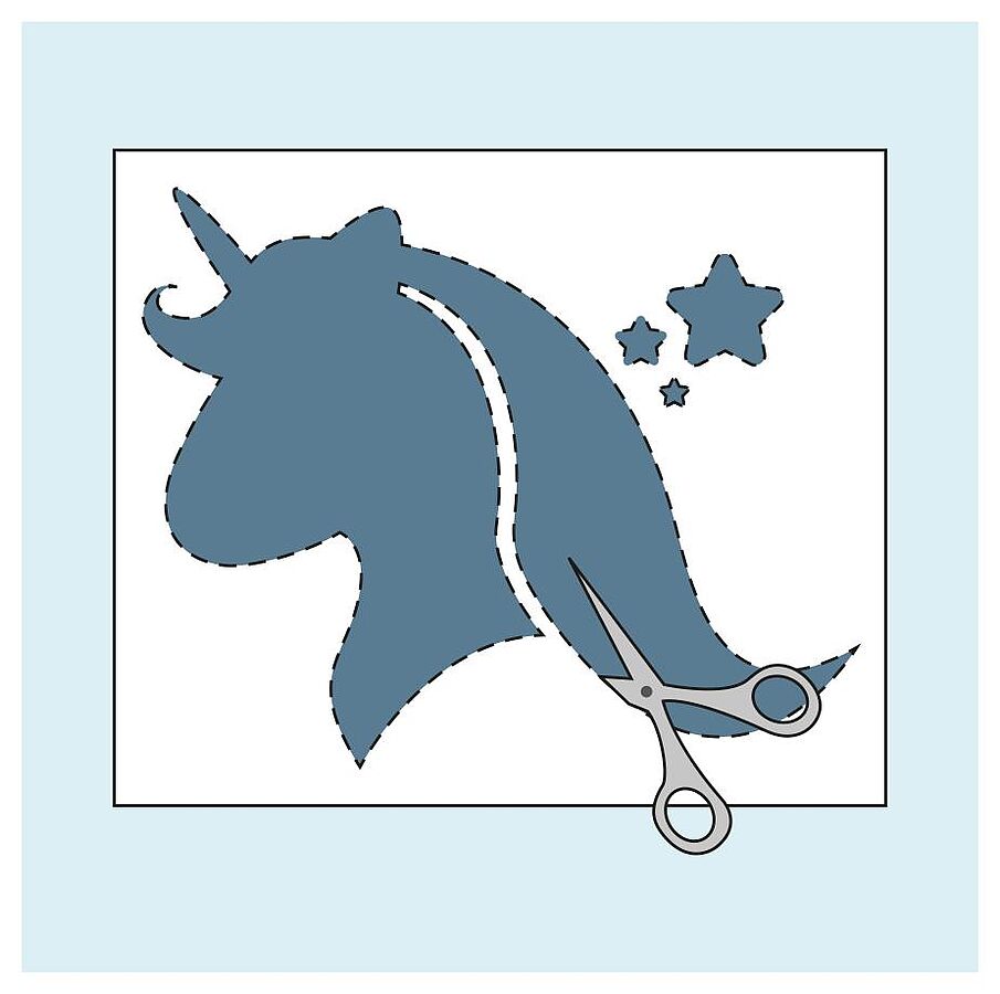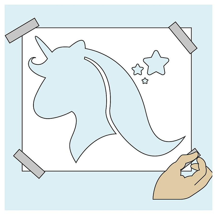 Einhorn-Schablone herunterladen und auf einem kräftigen Papier ausdrucken (alternativ können Sie die Vorlage auch auf ein Stück Karton kleben).