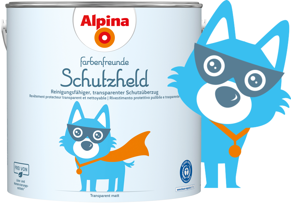 Alpina Farbenfreunde Schutzheld ist ein seidenmatter, transparenter Schutzüberzug, den Sie einfach auf die gestrichene Wand auftragen können. Dank des so entstehenden Schutzfilms haften Schmutz und Flecken jetzt nicht mehr so schnell an der Wand. Und wenn der Alltag doch mal Spuren hinterlässt, können Sie das meiste davon mühelos entfernen: einfach mit einem feuchten Tuch abwischen. Beim Auszug oder bei einer Renovierung lässt sich der Schutzfilm leicht überstreichen.