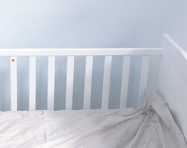 Das sehr viel sanftere Fischblau kommt hingegen rund um ihren Schlafbereich zum Einsatz. Blau gehört zwar zur einer kühleren Farbpalette und wird gern im Spielbereich eingesetzt. Ich aber mag das Sanfte daran. Großflächig und ohne störendes Dekor rund um ihr Bett wirkt es dann doch äußerst beruhigend. Eine Mischung aus Bett am Wasser und einer Liege zwischen den Wolken.